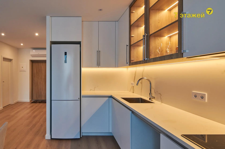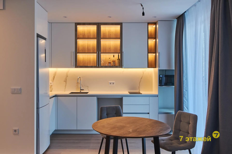 - просторная рабочая зона кухни со всей необходимой встроенной техникой (по желанию покупатель может установить посудомоечную машину либо оставить в нише зону хранения)