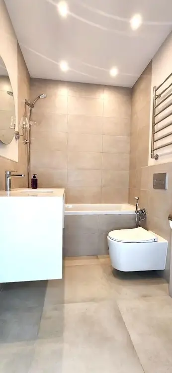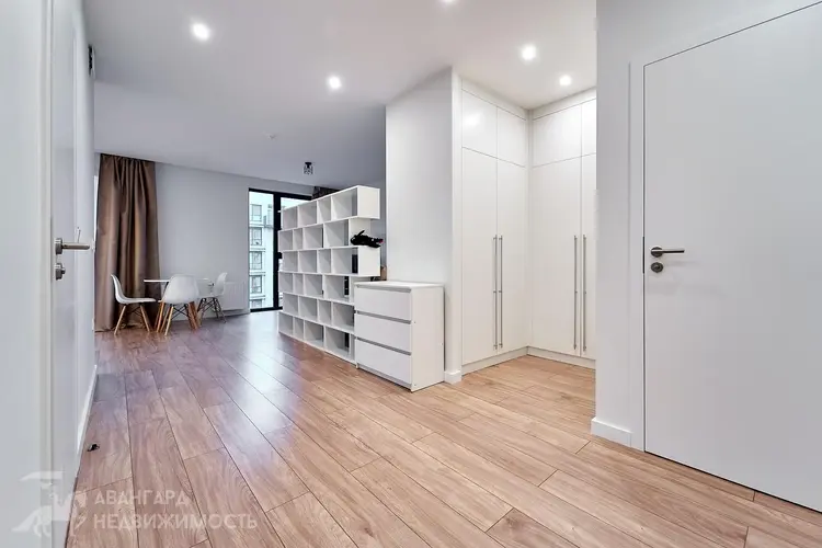 Современная планировка, решен вопрос с местами хранения: есть шкафы с подсветками, вместительная постирочная