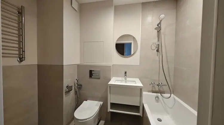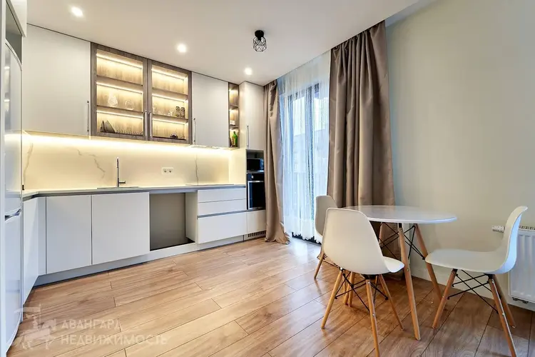 Ремонт из качественных и современных материалов в нейтральных тонах. На кухне фурнитура Blum.