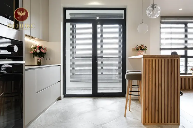 - Большие панорамные окна в пол с алюминиевым профилем.