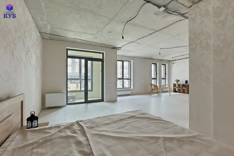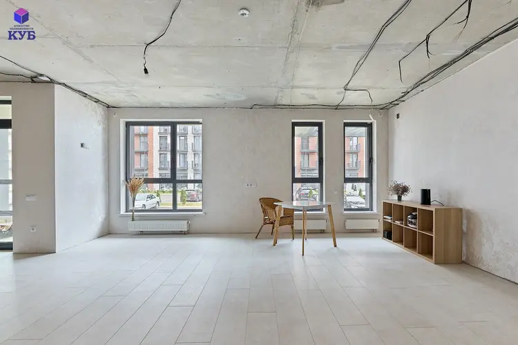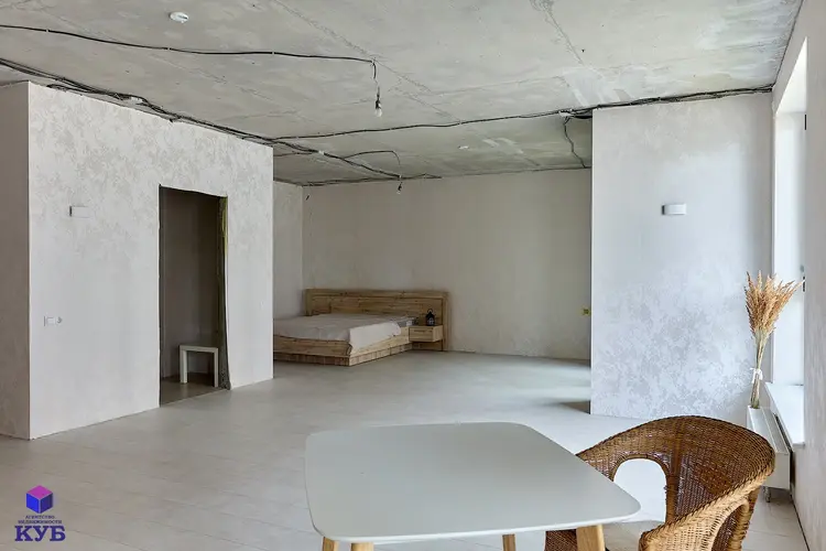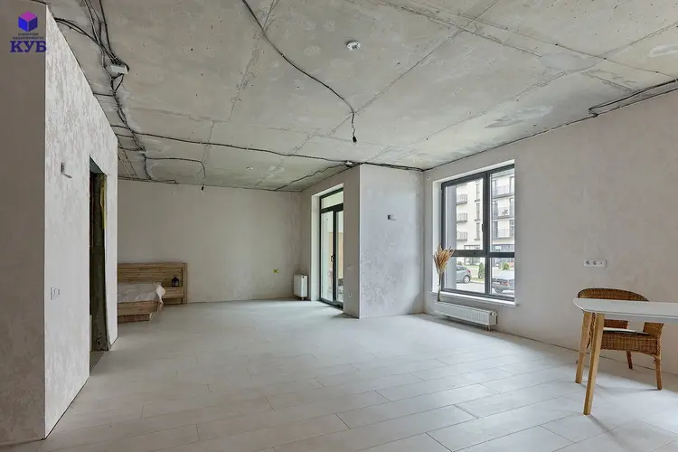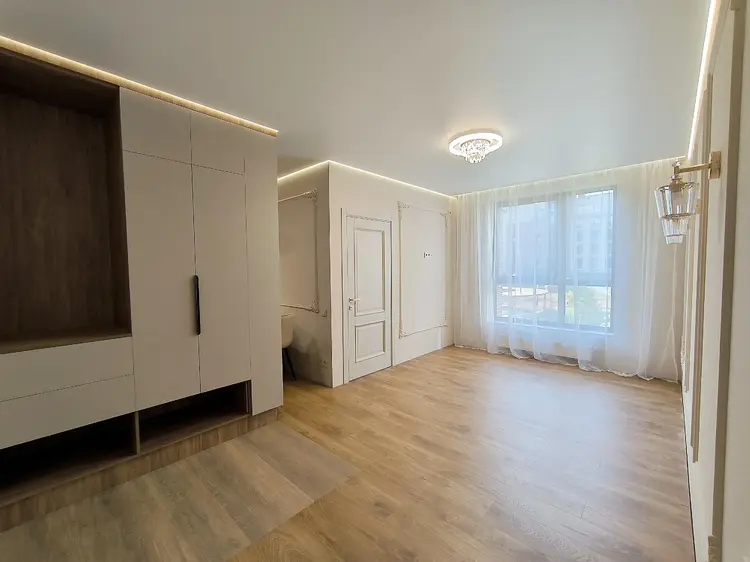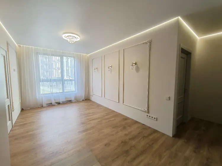 Общая площадь составляет 58,4 кв.м., из которых 44,2 кв.м. жилая. Высокие распашные французские окна с энергосберегающими стеклопакетами из алюминиевого профиля, на полу уложен ламинат 33 класса, стены выровнены.