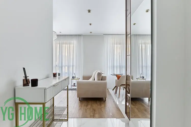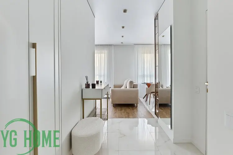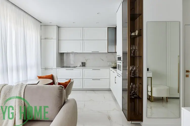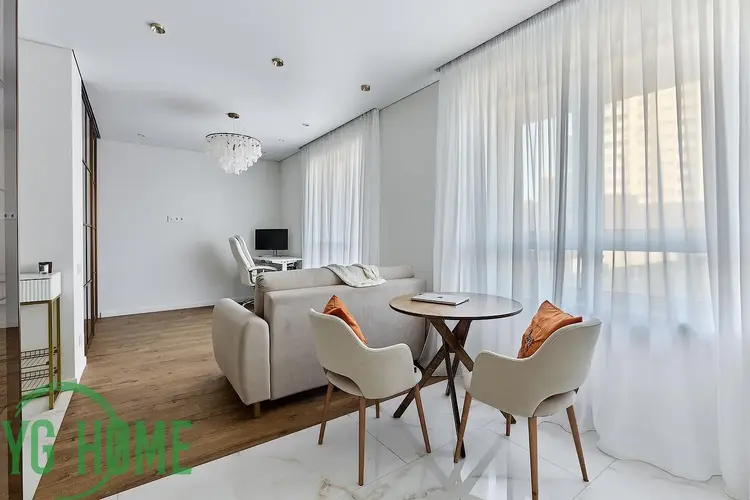 Грамотно сделана планировка квартиры с изолированным спальным местом, зоной кухни и гостиной зоной. Спальня зонирована стеклянной перегородкой с раздвижными дверями и шторами блэкаут.