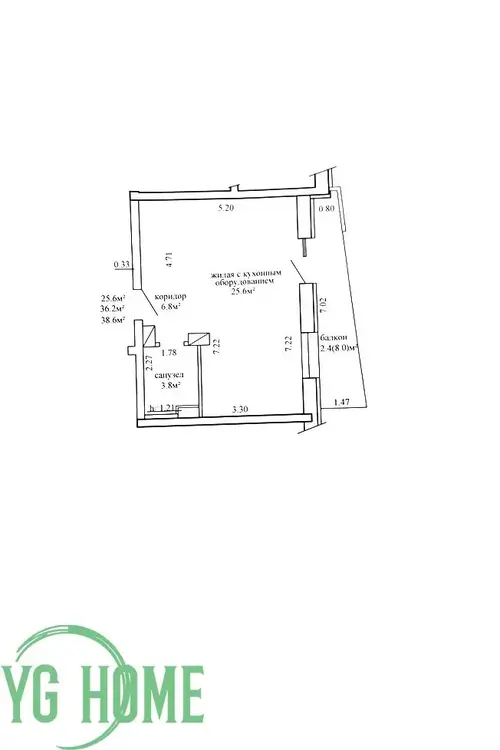 - Площадь квартиры СНБ – 38,6 м2, общая – 36,2 м2, жилая 25,6 м2.