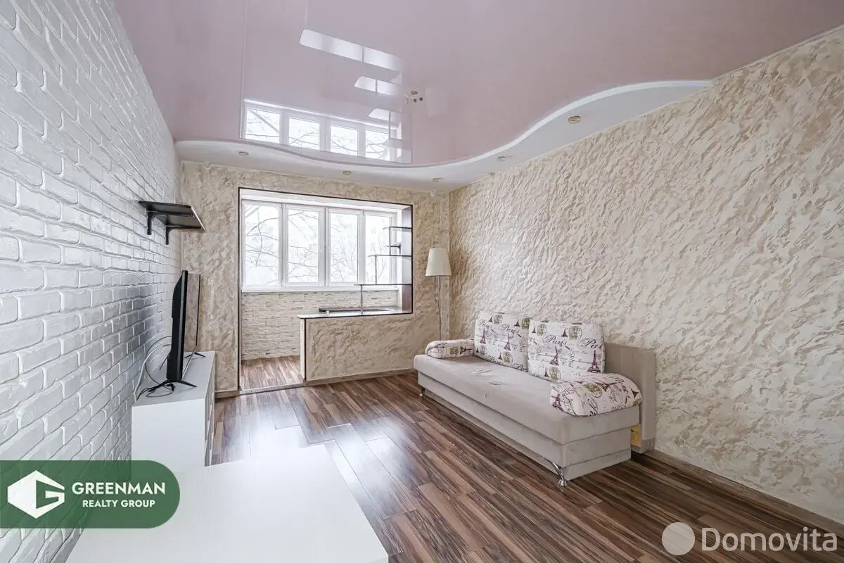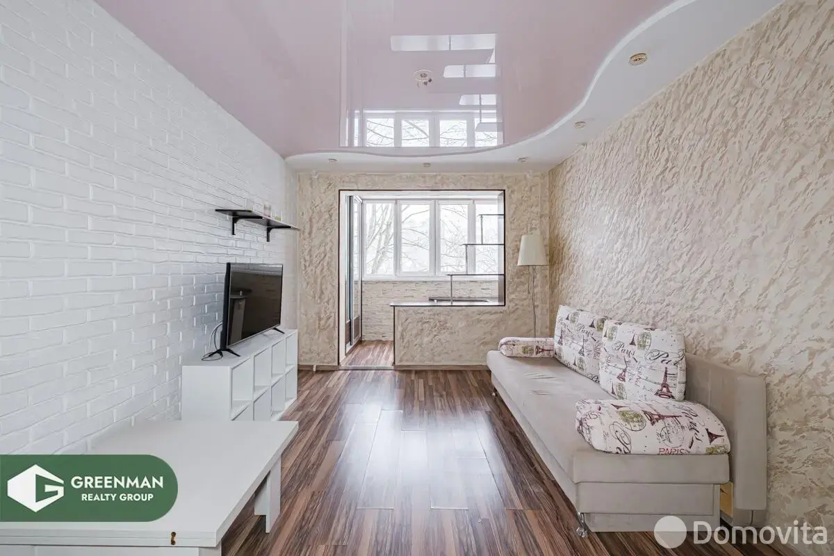 Главная фишка квартиры — жилая комната с лоджией, которая превращена в полноценную рабочую зону. У вас появляется отдельное место под кабинет, учёбу или хобби: светло, уютно, функционально. В комнате аккуратный современный ремонт: ламинат «под дерево», многоуровневый натяжной потолок с точечным светом, фактурные стены и стильная акцентная стена под белый декоративный кирпич. Большой зеркальный шкаф-купе во всю стену решает вопрос хранения и визуально расширяет пространство.