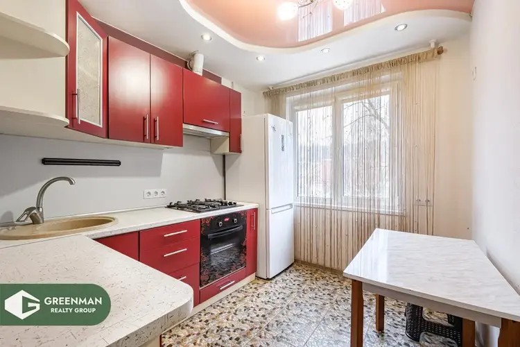 Кухня — не «для галочки», а реально удобная: современный гарнитур, газовая варочная панель, духовой шкаф, вытяжка, холодильник. Светло, чисто, есть полноценной обеденной зоной. На полу практичная плитка — удобно в уходе и выглядит аккуратно.