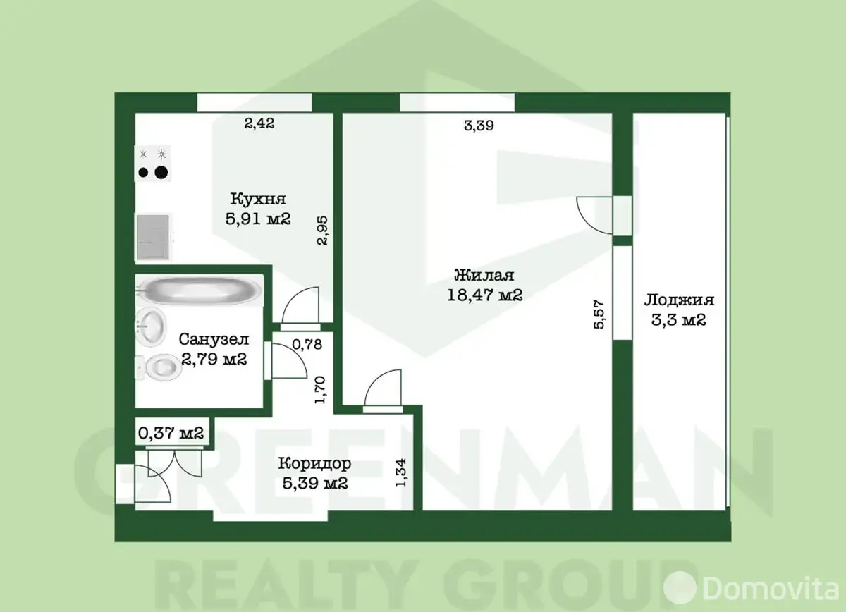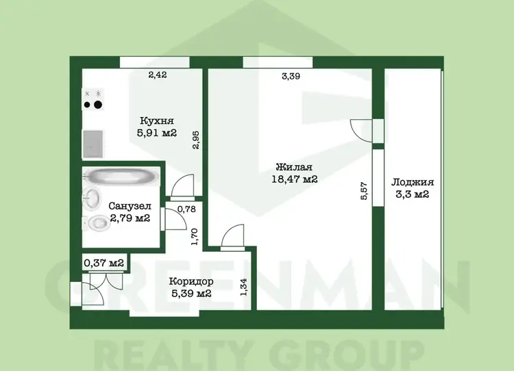 удобная планировка: комната, кухня, санузел, балкон — всё продумано