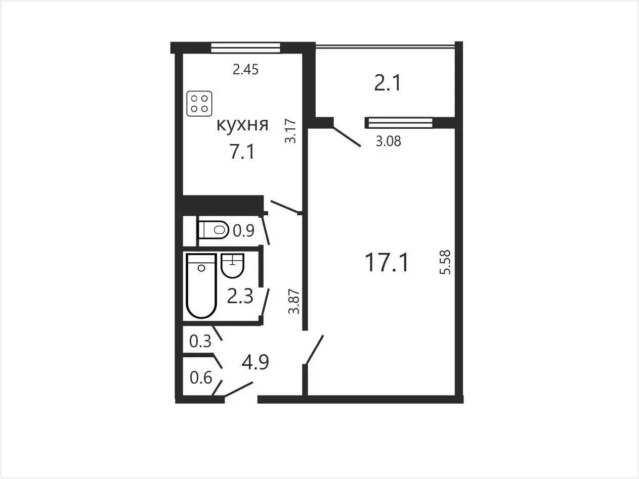 Основные характеристики- Площадь по СНБ: 35.3 м² Общая площадь: 33.2 м² Жилая площадь: 17.1 м² Кухня: 7.1 м²