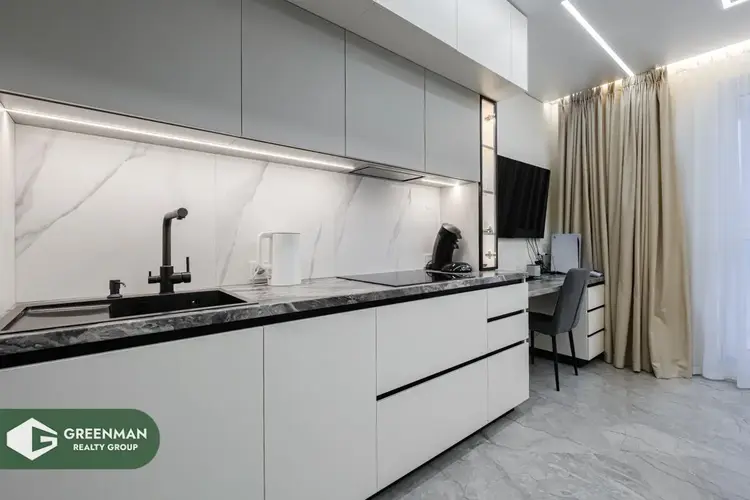 Полностью укомплектованная кухня с техникой от компании BOSCH, продуманны места хранения посуды и других приборов. Кондиционер и бесплатный теплый пол в период отопления)