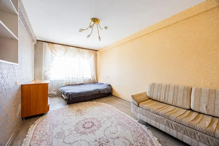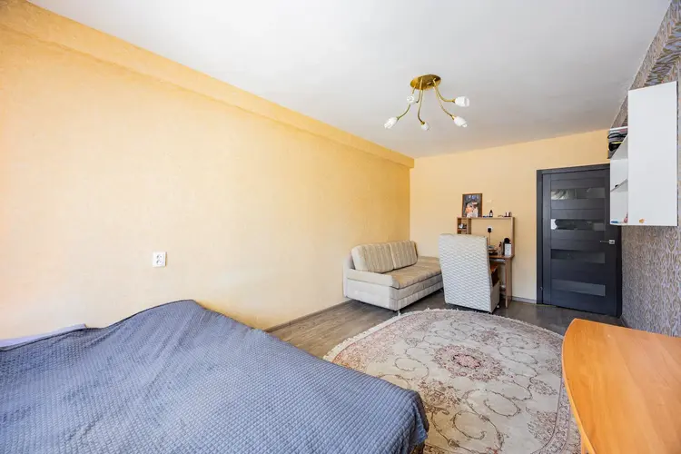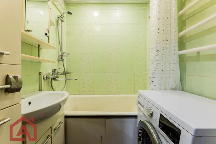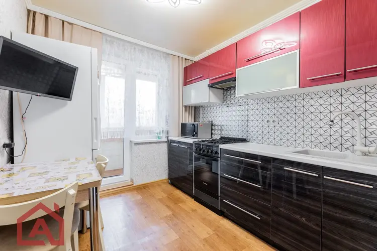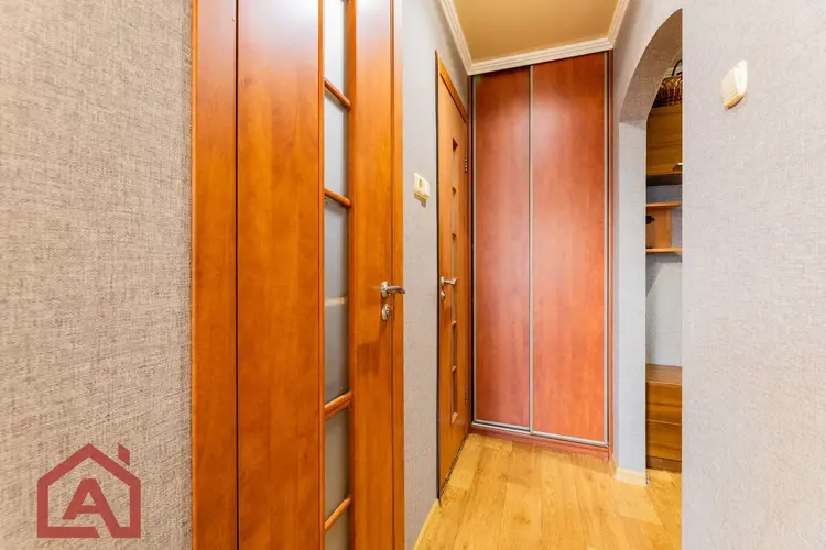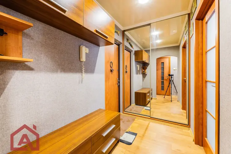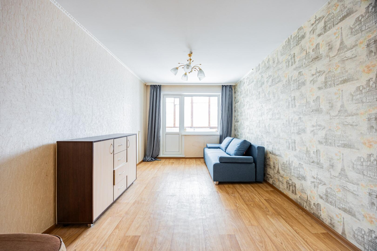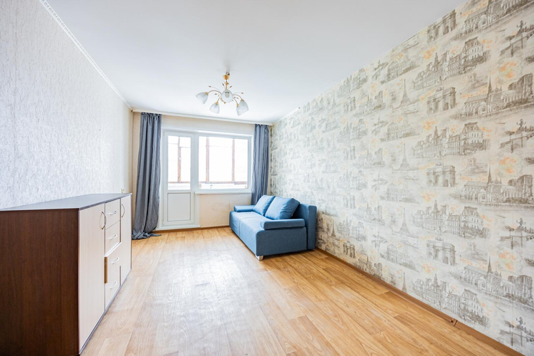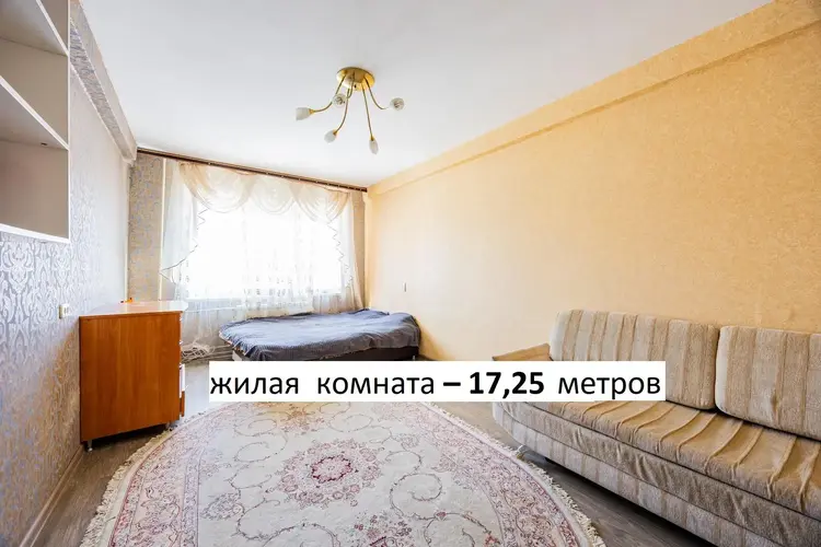 Квартира площадью 35,2 м2 с большой комнатой – 16,7 м2 и лоджией. В комнате и прихожей встроенные вместительные шкафы в соответствующей цветовой гамме. На всех окнах и на лоджии стеклопакеты, на полу – линолеум, уложенный на доску, потолки натяжные.