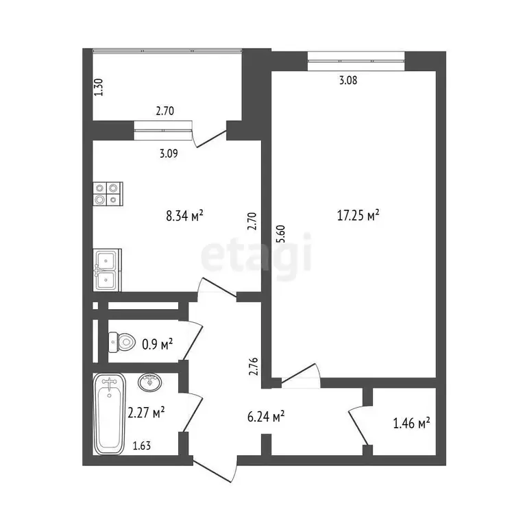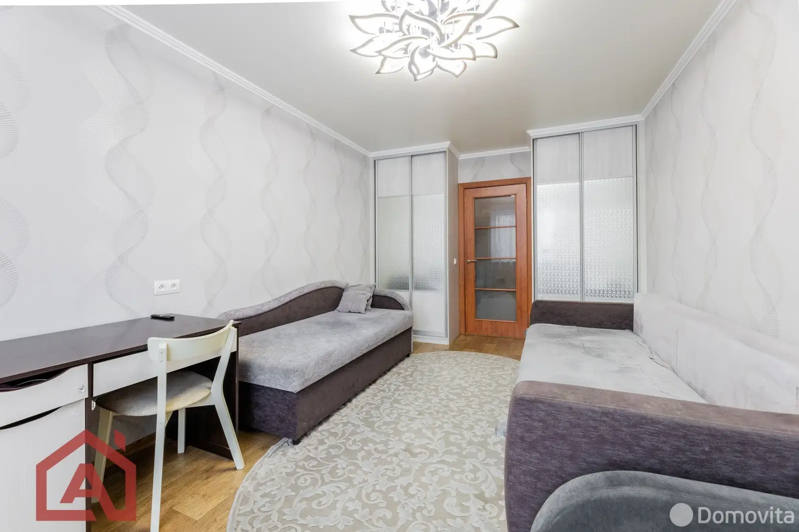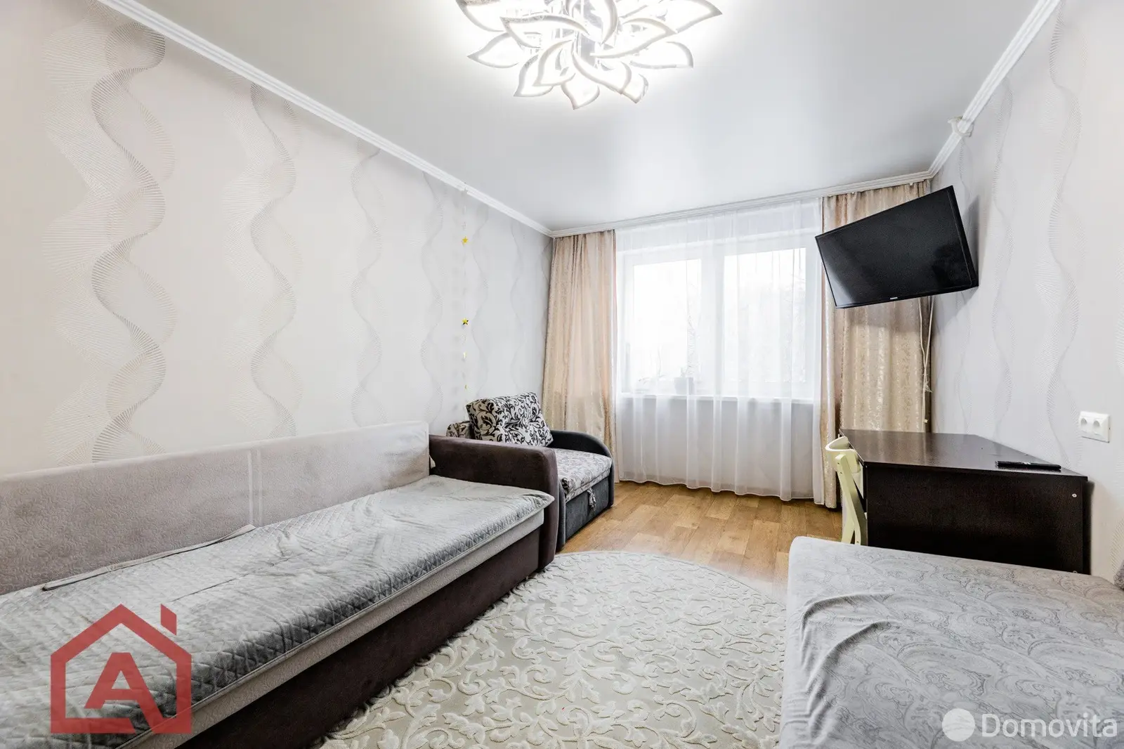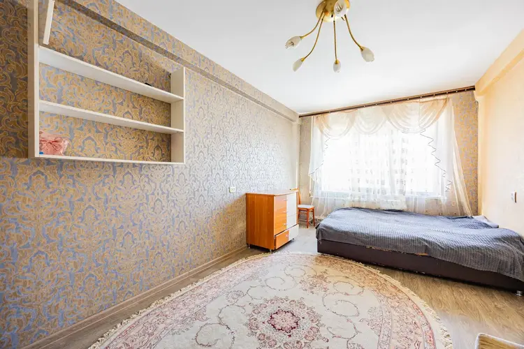 Квартира площадью 35,2 м2 с большой комнатой – 16,7 м2 и лоджией. В комнате и прихожей встроенные вместительные шкафы в соответствующей цветовой гамме. На всех окнах и на лоджии стеклопакеты, на полу – линолеум, уложенный на доску, потолки натяжные.