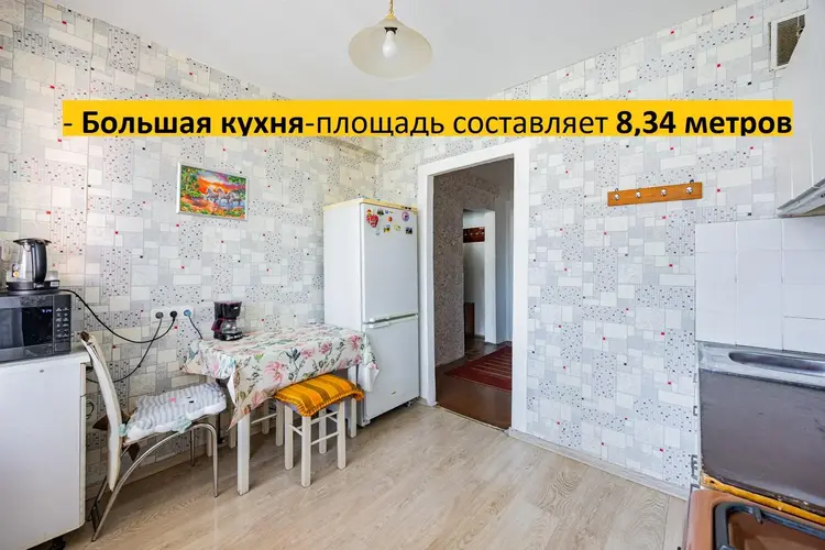 - Большая кухня-площадь кухни составляет 8,34 метров, жилая комната – 17,25 метров;