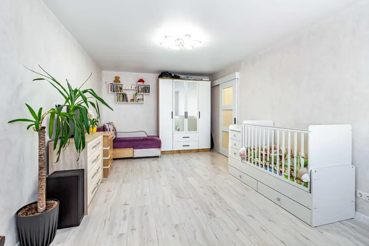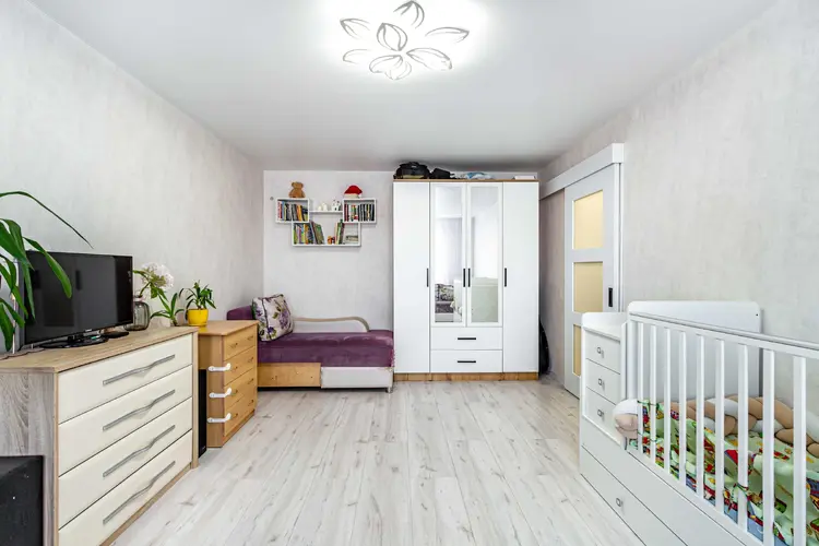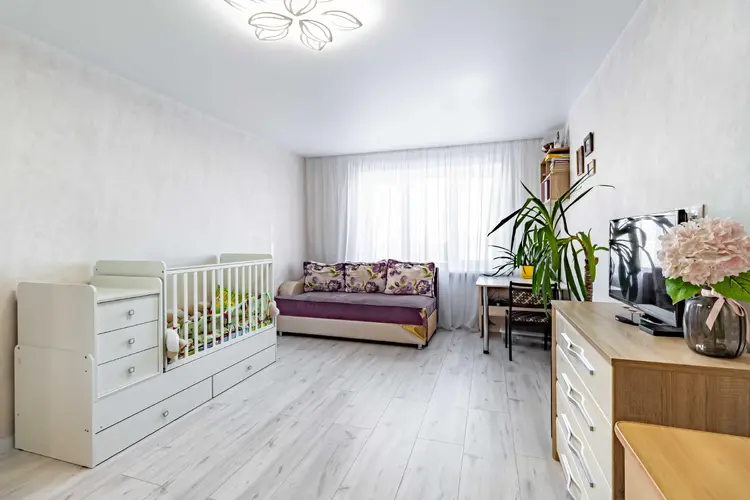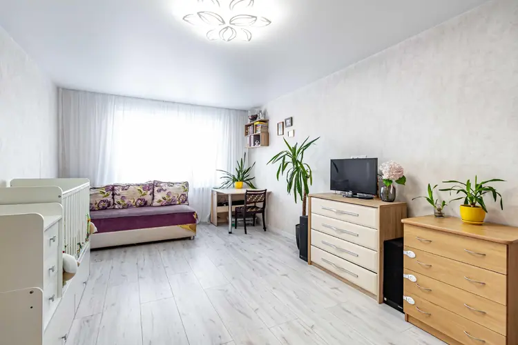 Просторная жилая комната (21,7 м2) позволяет зонировать пространство: выделить зону спальни с двуспальной кроватью и зону гостиной с полноразмерным диваном.