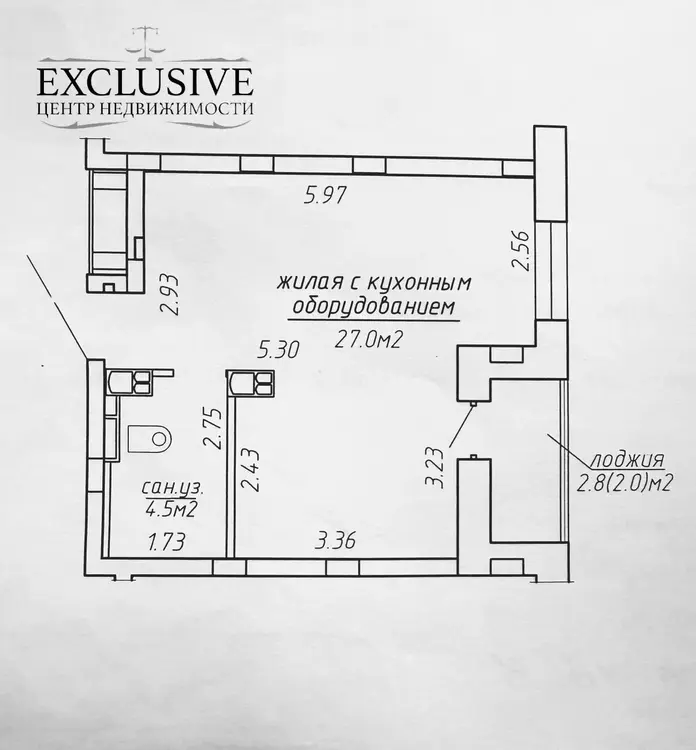 Площадь СНБ 33,2 /общая 31,3 / жилая с кухонным оборудованием 26,6 кв.м. Совмещенный санузел, застекленная лоджия.
