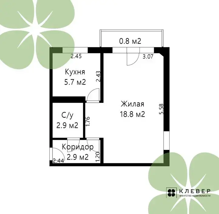 · кухня 5,7 м2 и отдельная комната 18,8 м2 с двумя окнами (при желании можно зонировать пространство)
