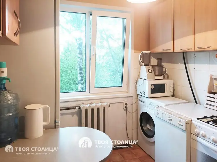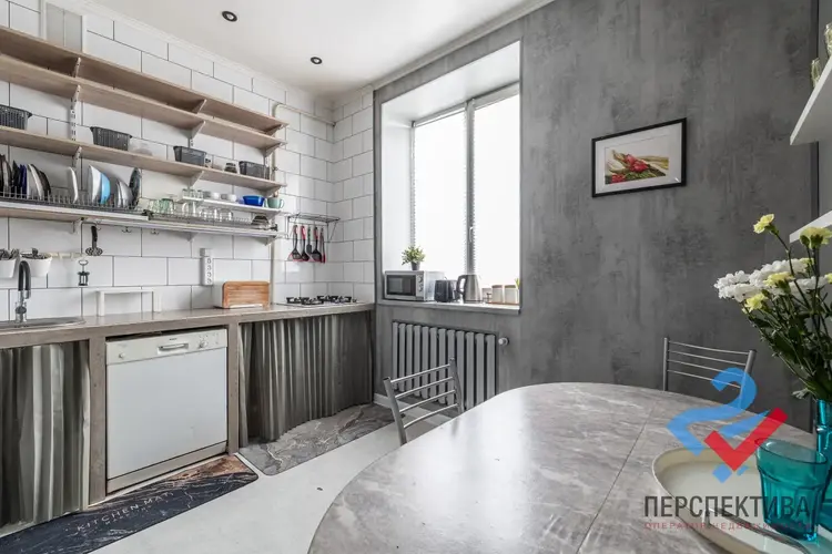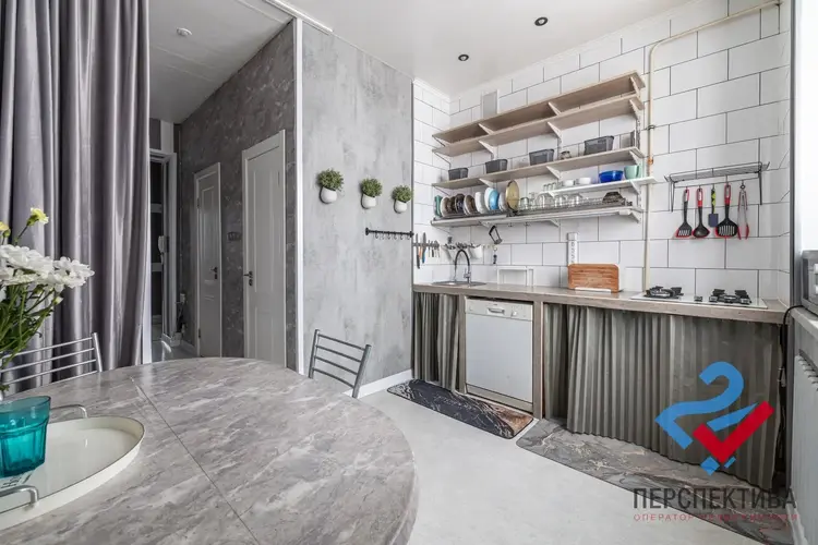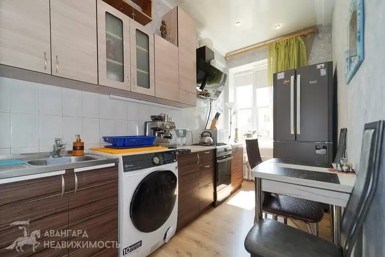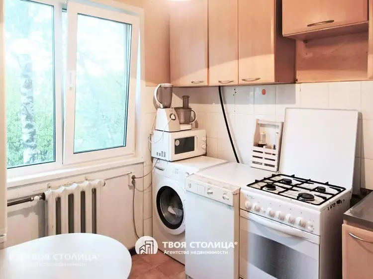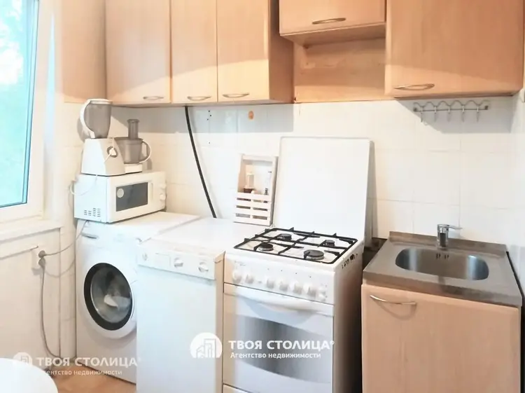 На кухне рабочая зона облицована керамической плиткой. Кухонный гарнитур. Новая современная техника. Кухонный стол при необходимости раскладывается.