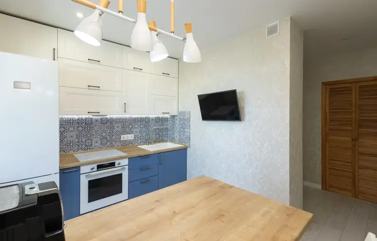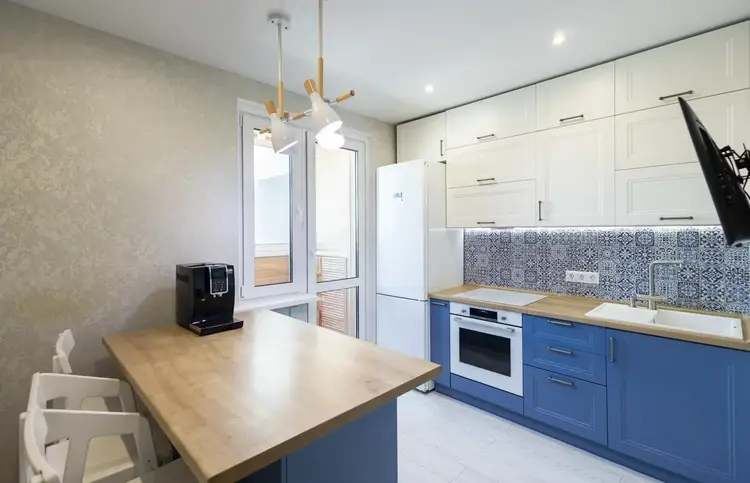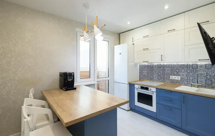 Изюминка квартиры - кухонный остров с дополнительной системой хранения — удобно для семьи и приёма гостей.