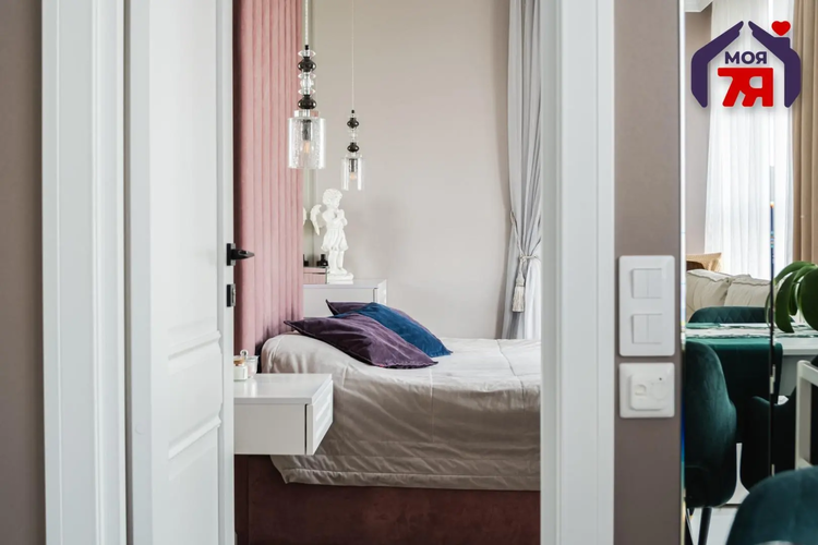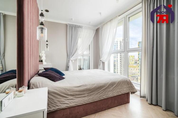 - Основная спальня также продумана до мелочей: паркетная доска на полу, норвежские обои и зеркала на стенах, натяжной потолок. Вся мебель, включая кровать и шкаф-купе с крашеными фасадами, изготовлена на заказ и остаётся новому владельцу.