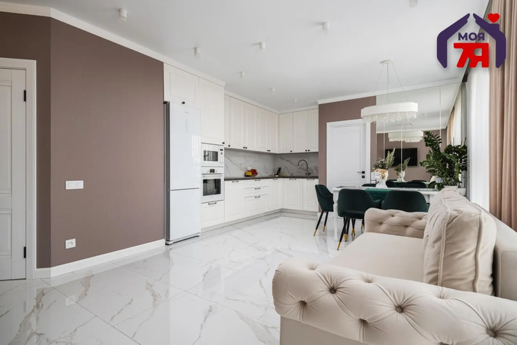 - Гостиная совмещена с кухней и представляет собой просторное, наполненное светом помещение с выходом на лоджию. Пол выполнен из итальянского керамогранита 120×60 с подогревом, стены отделаны норвежскими обоями и зеркальными вставками, потолок натяжной с парными люстрами "MauToni" и точечными светильниками "Novodvorski".