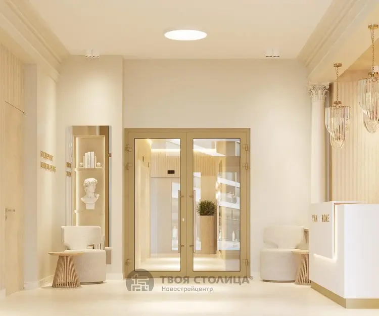 В дизайнерском лобби дома находится стойка консьержа, место отдыха, букшеринг, туалетная комната с пеленальным столиком, байк-бокс (в просторном фойе можно также разместить детские коляски и сэкономить место в квартире).