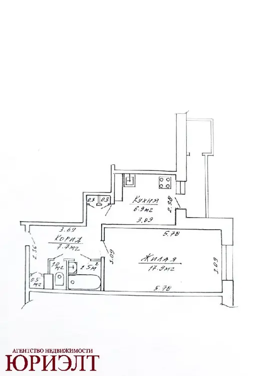 Комната 17.9 м2, кухня 6.9 м2.