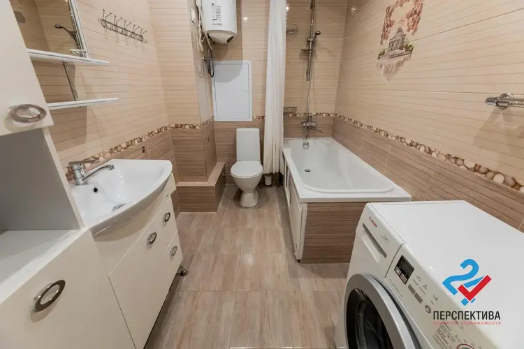 Санузел совмещённый: удобный и просторный, с качественным ремонтом, есть выводы для подключения стиральной машины, большая акриловая ванна, места для хранения.