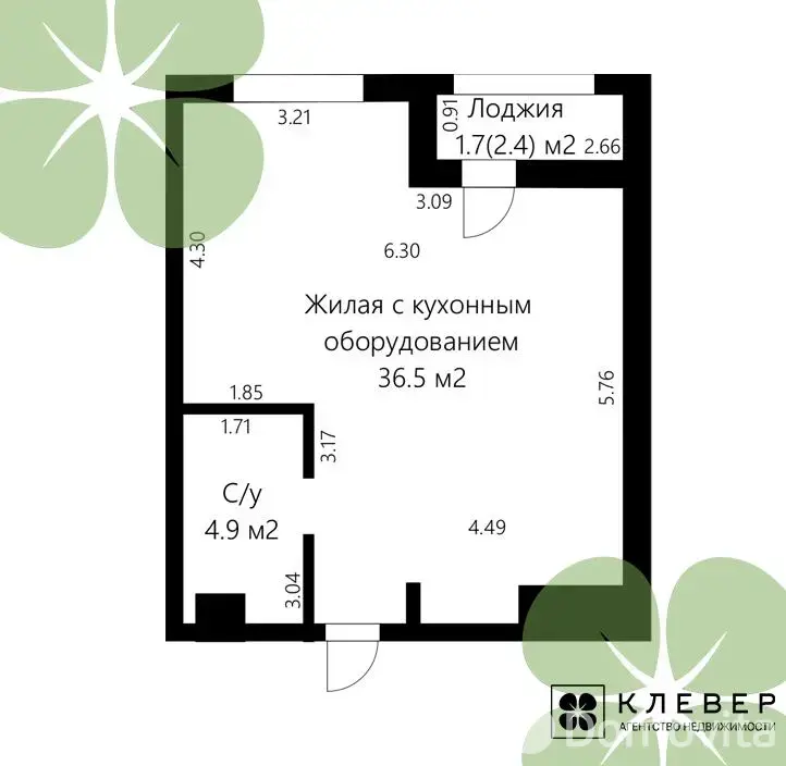 Квартира общей площадью 43.1 м2, располагается на 6-ом этаже из 12