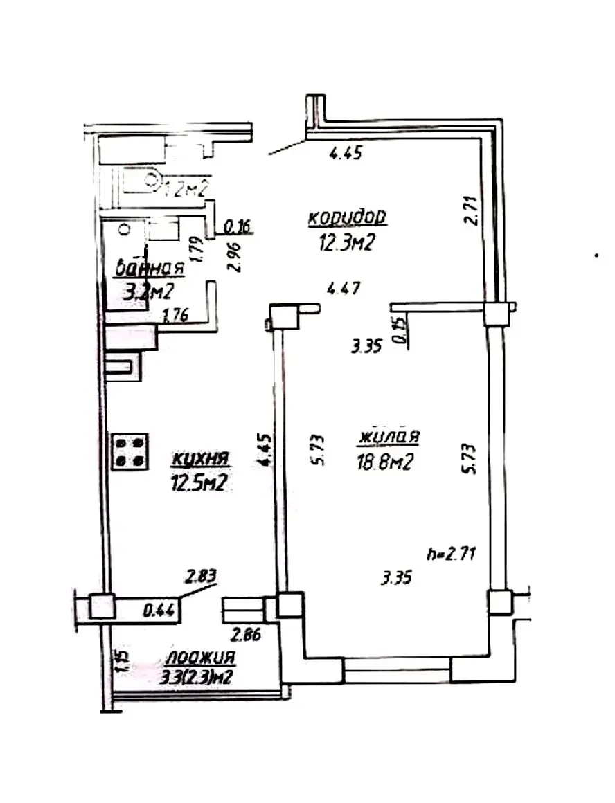 Общая площадь по СНБ-50.3м2, жилая площадь-18.8м2, площадь кухни-12.5м2, высота потолка: 2.71м.