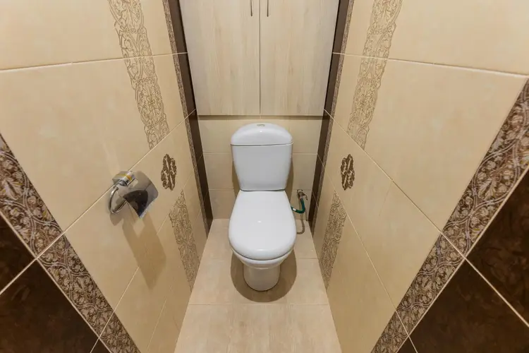 ∙ В коридоре вместительная гардеробная. На полу плитка. На стенах венецианская штукатурка.