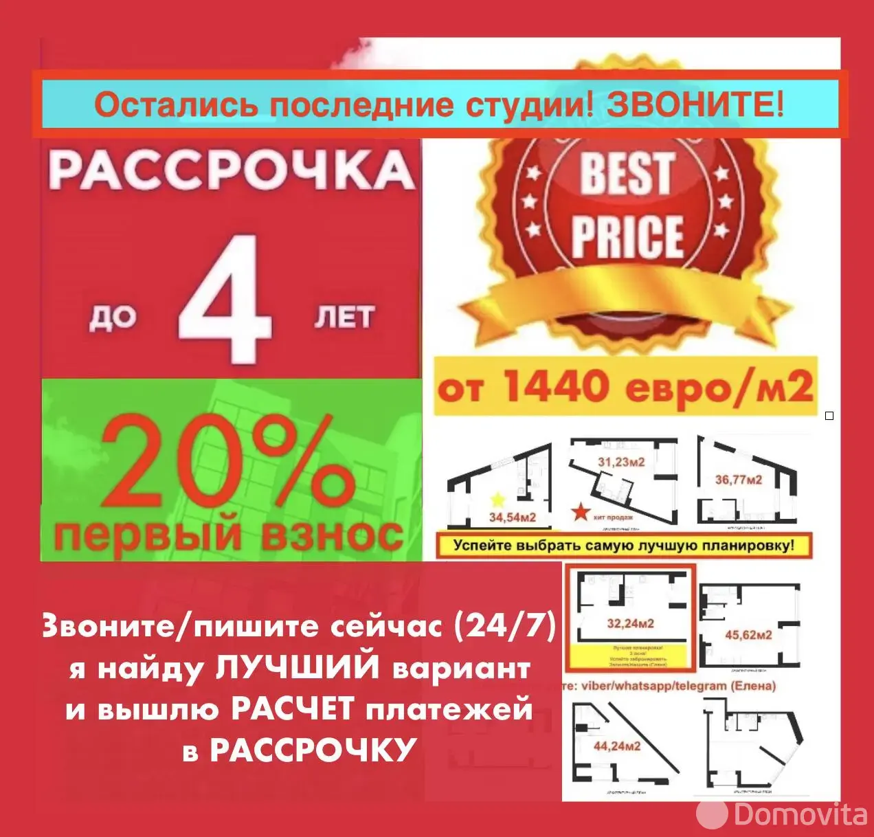 Выбор этажей и планировок! Вышлю РАСЧЕТ платежей в РАССРОЧКУ на 4 года!