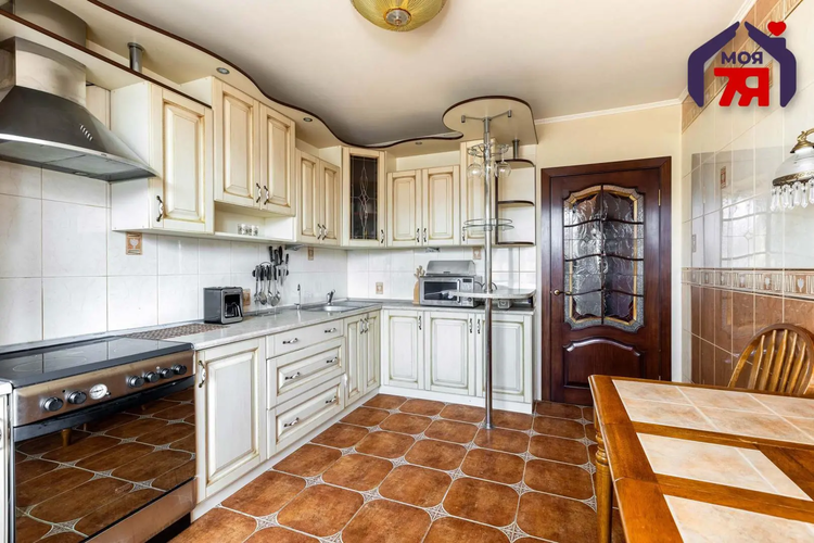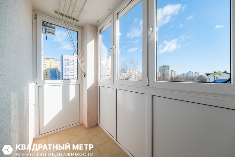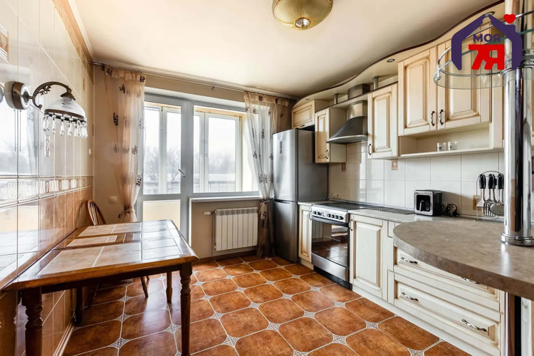 Кухня просторная с выходом на застеклённый балкон позволяет организовать уютную зону отдыха, хранения или утренний кофе с видом на город.