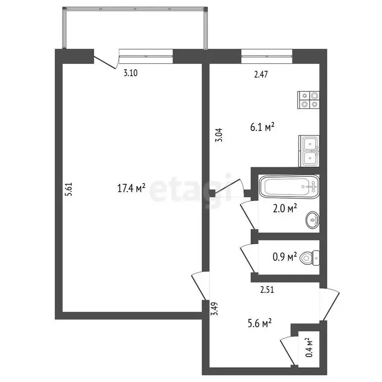 Общая площадь: 33,3 м2 (по СНБ), включает просторную жилую зону 17,4 м2 и уютную кухню 6,1 м2.