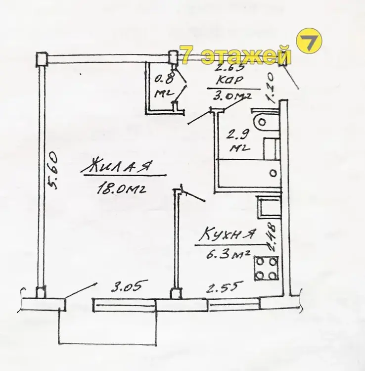 Комнаты: жилая - 18 м² с балконом, кухня - 6,3 м2.
