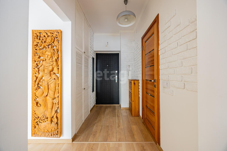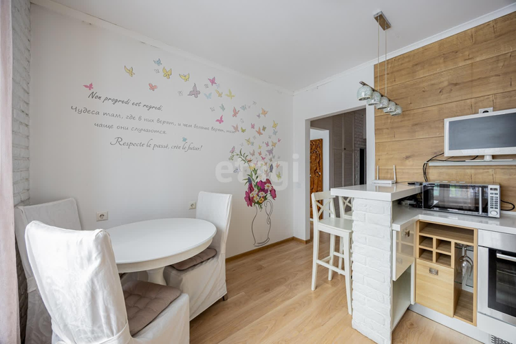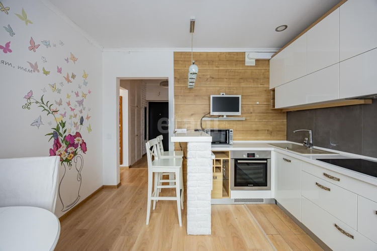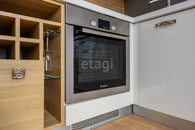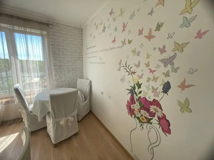 Особая гордость квартиры — кухня с эксклюзивной ручной росписью. Это не просто интерьер, а художественный акцент, который делает пространство уникальным и подчеркивает индивидуальность владельца. Здесь хочется принимать гостей, создавать кулинарные шедевры и наслаждаться моментом. Французское окно, добавляющее пространству легкости и света, когда оно открыто, кухня «дышит», сливаясь с окружающей зеленью, а пространство расширяется, давая ощущение просторной летней террасы. Идеально для семейных обедов и вечерних посиделок с друзьями