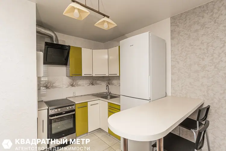 2. Кухонный гарнитур с барной стойкой и всей необходимой бытовой техникой: холодильник, плита с духовкой, вытяжка.