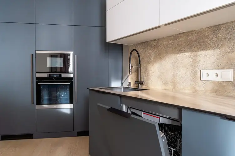 • Кухонная зона: Шкафчики в элегантном сочетании белоснежного и оливково-зеленого цветов имеют гладкие фасады, которые радуют глаз и обладают множеством практичных характеристик: низкое светоотражение, устойчивость к отпечаткам пальцев, влагостойкость, термостойкость и ударопрочность. Кухня оснащена техникой от брендов AEG и Bosch, а встроенный холодильник и морозильник предлагает достаточно пространства для хранения продуктов.