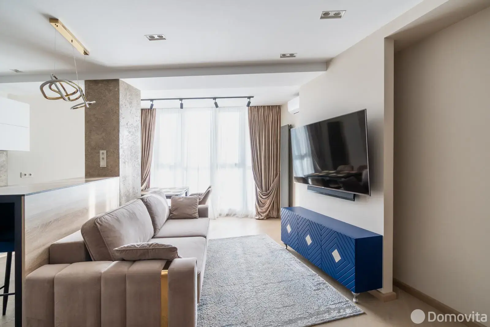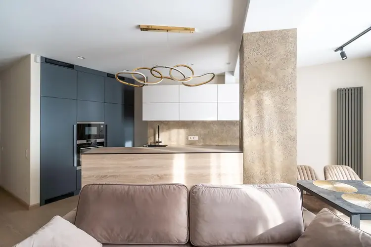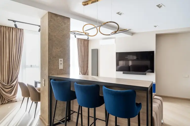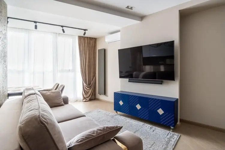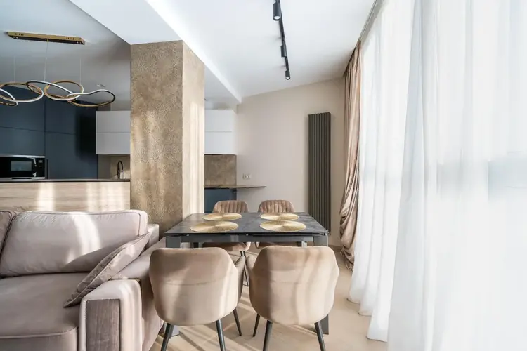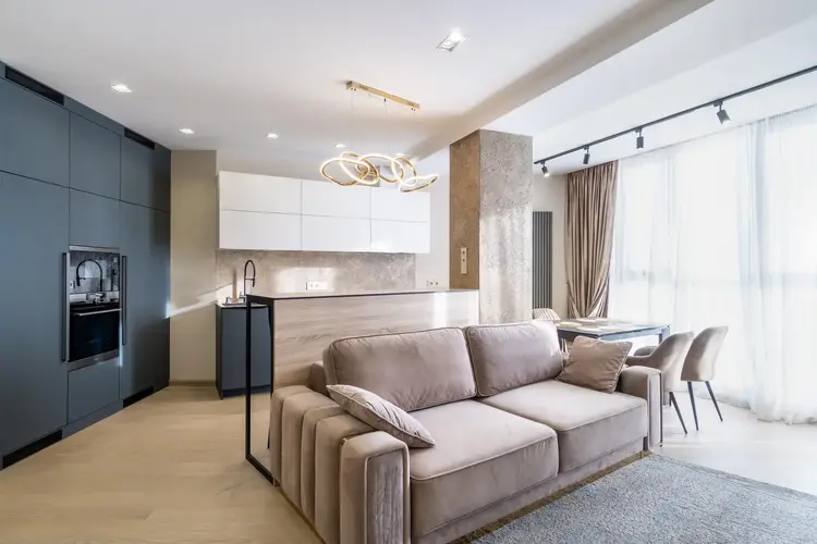 • Гостиная: Просторное помещение наполнено мягким светом, который льется из больших окон. Основным акцентом здесь служит стильный диван итальянского производства, обитый мягкой бархатной тканью нейтральных тонов с изящными металлическими акцентами.