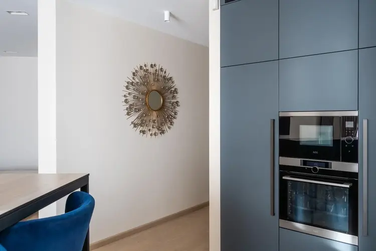 • Светлая входная группа: Акцентные синие шкафы с фасадами, украшенными ритмичными геометрическими фигурами, не только служат для хранения верхней одежды и обуви, но и скрывают бытовую технику. Завершается входная группа стильным зеркалом, которое визуально увеличивает пространство и позволяет быстро проверить внешний вид перед выходом.