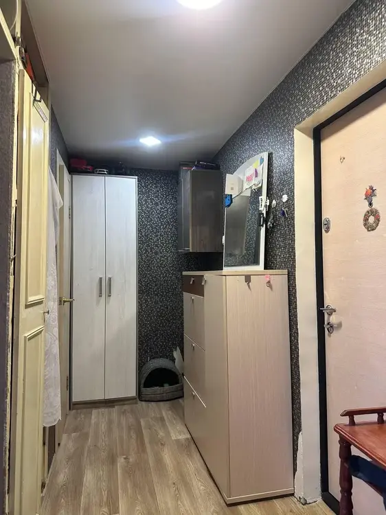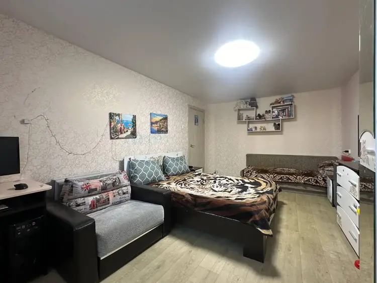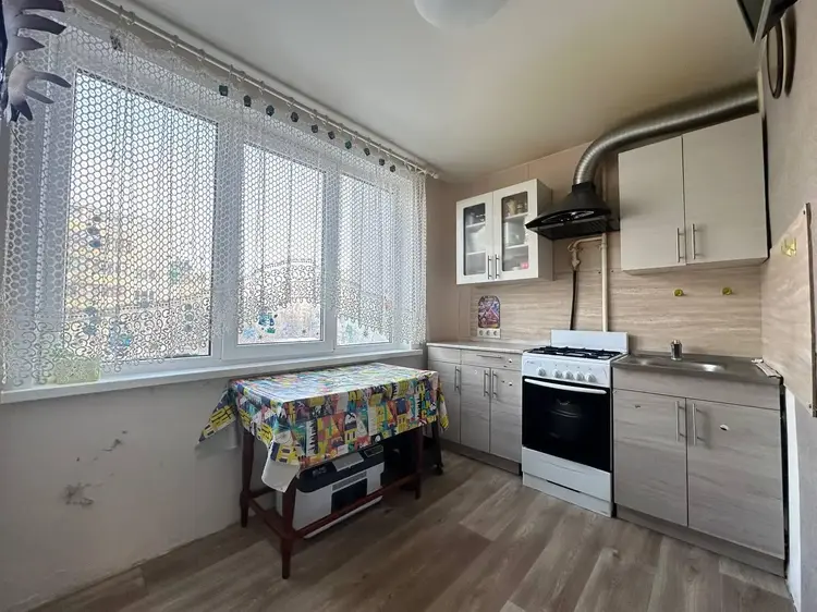Площадь квартиры по СНБ 35.8 м2, жилая площадь - 18 м2, кухня 7.5 м2. Квартира в аккуратном жилом состоянии. Заменена вся проводка на медную, залиты новые полы стяжка. Навесная кухня - останется новым хозяевам. На полу линолеум, установлена металлическая дверь.