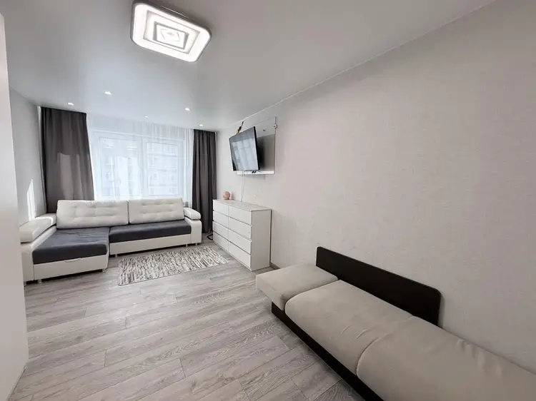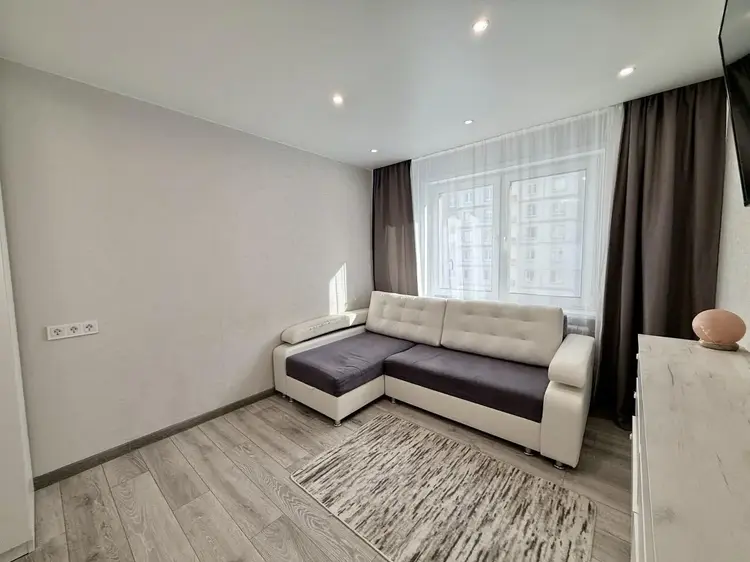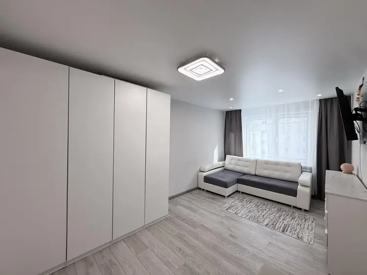 В жилой комнате на полу хороший ламинат. Свежие обои на стенах. Потолки матовые натяжные. В комнате есть большой и удобный угловой диван. Также в комнате есть вместительный белый шкаф и комод для хранения вещей.