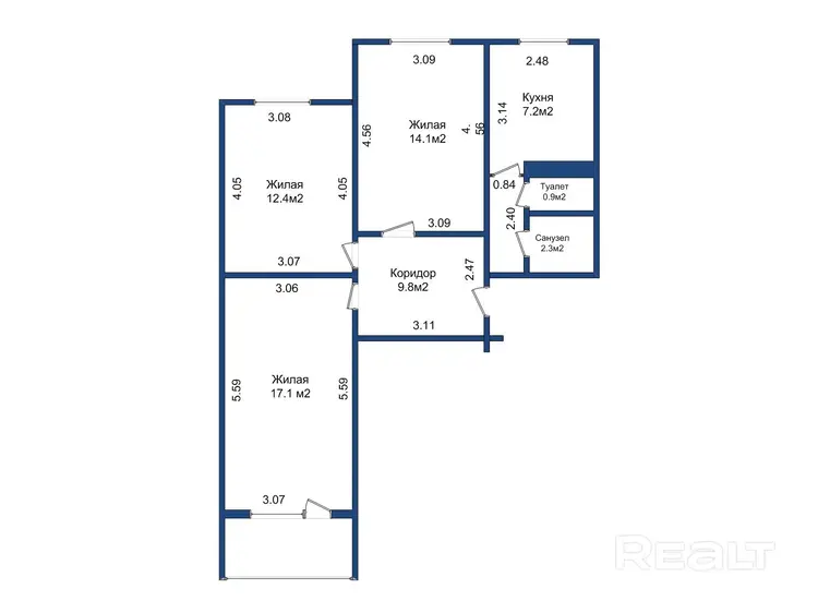 · Жилая комната: 12,6 м2.