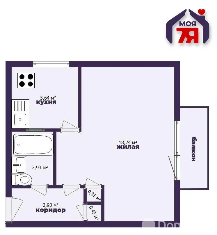 - Квартира светлая, с продуманной планировкой: просторная жилая комната площадью 18,24 м2, аккуратная кухня 5,64 м2, где легко разместится все необходимое, а также совмещенный санузел и удобный коридор с нишей под шкаф или систему хранения. Из комнаты есть выход на балкон, где можно обустроить уютное место для отдыха или мини-зимний сад.