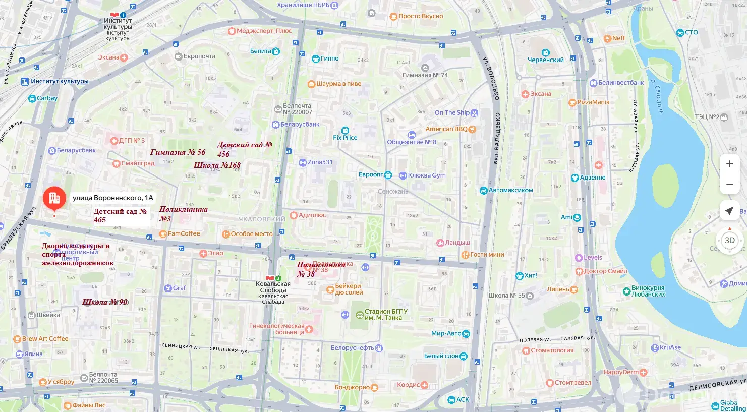 Микрорайон с развитой инфраструктурой! 5-7 минут до станций метро «Институт Культуры» и «Ковальская Слобода». В шаговой доступности находятся: детские сады, школы, гимназия, детская и взрослая поликлиники, спортивные и медицинские учреждения, магазины и объекты сервисного обслуживания, торгово-развлекательные центры, спортивные и игровые площадки.