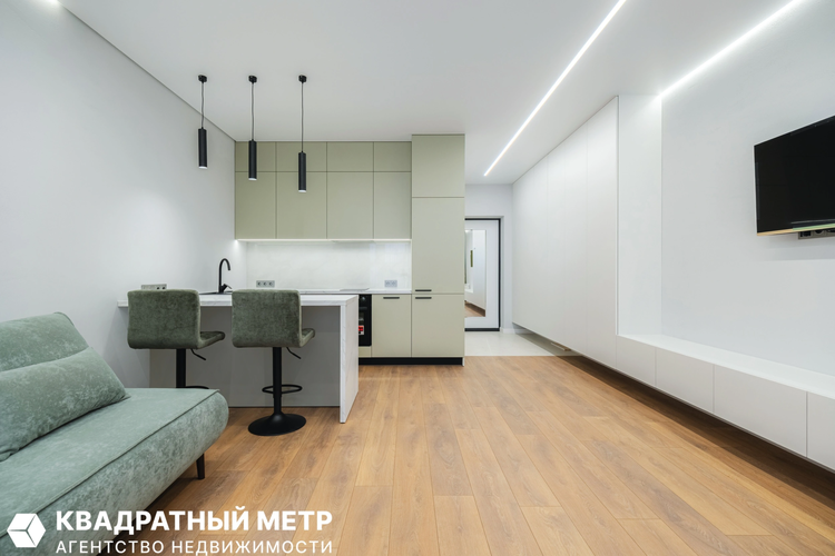Квартира-студия 27,8 м2, расположенная по ул. Жореса Алферова, д.5 Дом «Лима» 1. Абсолютно новая квартира формата Студия, Вы можете стать ее первым жильцом! Установлена мебель, ТВ-зона и система встроенных шкафов, объединяющая коридор с жилой комнатой. Натяжные потолки со световыми линиями и парящей подсветкой подчеркивают сдержанные линии интерьера, а декоративная штукатурка на стенах и облицованный керамогранитом парапет обеспечивает его практичность. 2. Стильный кухонный гарнитур с барной стойкой и мягкими стульями оборудован всей необходимой бытовой техникой: встроенным холодильником, варочной панель, духовкой, вытяжкой и посудомоечной машиной. 3. Обзорный 19-й этаж открывает панорамный вид на город. В квартире также есть небольшой балкон-терасса. 4. Просторный совмещенный санузел: оборудован душевой зоной Kerama Marazzi со стеклянной перегородкой, инсталляцией Vitra, стильным умывальником из керамогранита, электрическим полотенцесушителем, мебелью и стиральной машиной Indesit. Установлены качественные немецкие смесители. Полы в ванной и душевой зоне с подогревом. 5. Новый дом «Лима» 2024 года постройки: 3 лифта (грузовой, обычный и панорамный), дизайнерское лобби с видеонаблюдением и уголком обмена книгами, комната для хранения велосипедов, а также очень опрятный просторный двор. 6. Недалеко крупный гипермаркет Avia Mall, рядом школа с бассейном, магазины, детский сад и поликлиника. А теперь к техническим параметрам: 1. Планировка: общая площадь по СНБ – 27,8 м2, жилая площадь 24,1 м2 (с учетом присоединения лоджии 2,3м2 к жилой комнате). Открытый балкон-терасса ,1,1 м2. Совмещенный санузел: 4,1 м2. На стенах декоративная штукатурка, в прихожей и на парапете керамическая плитка Ape Grupo (Испания), в санузлах Laparet (Индия), в жилой зоне качественный ламинат Quick Step, потолки- натяжные с парящей подсветкой и световыми линиями, новая входная металлическая дверь. Вся мебель собрана на фурнитуре Blum. Условия продажи: чистая продажа. Быстрый выход на сделку. Записывайтесь на просмотр по указанному номеру телефона! Квартиру можно купить в кредит! Смотрите еще больше в нашем Telegram канале @kvadratnyjmetr и на сайте https://m2.by УП «Квадратный метр» УНП: 190003285 Лицензия 02240/29_ от 17.02.2005, Министерство юстиции РБ Договор 90/24 от 17.02.2026