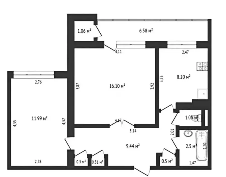 Просторная лоджия 6,58 м2 с дополнительной холодной зоной для хранения в виде шкафа (1,06 м2).
