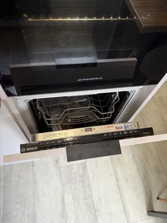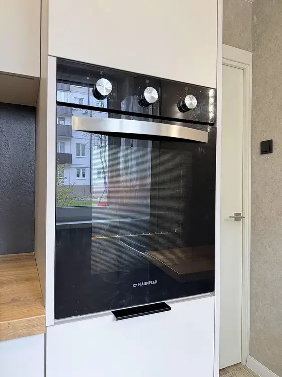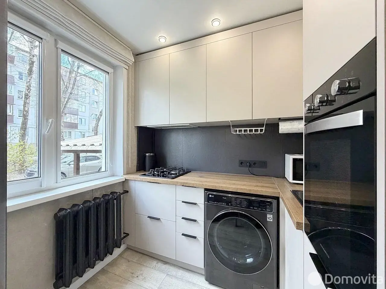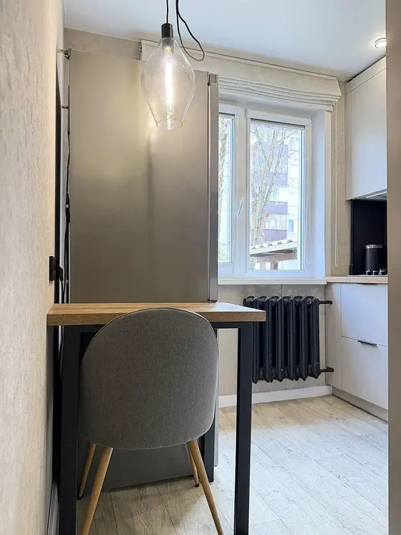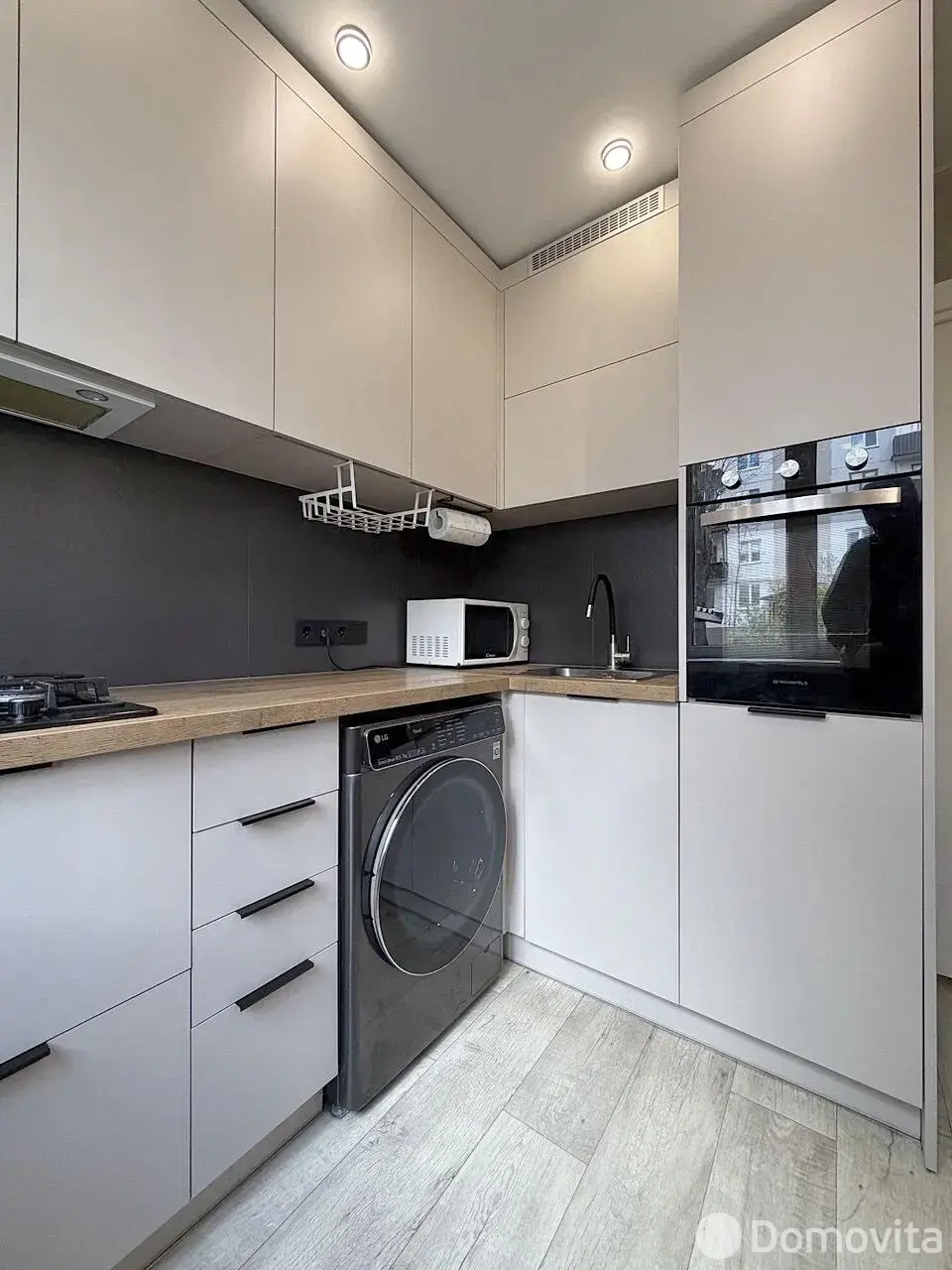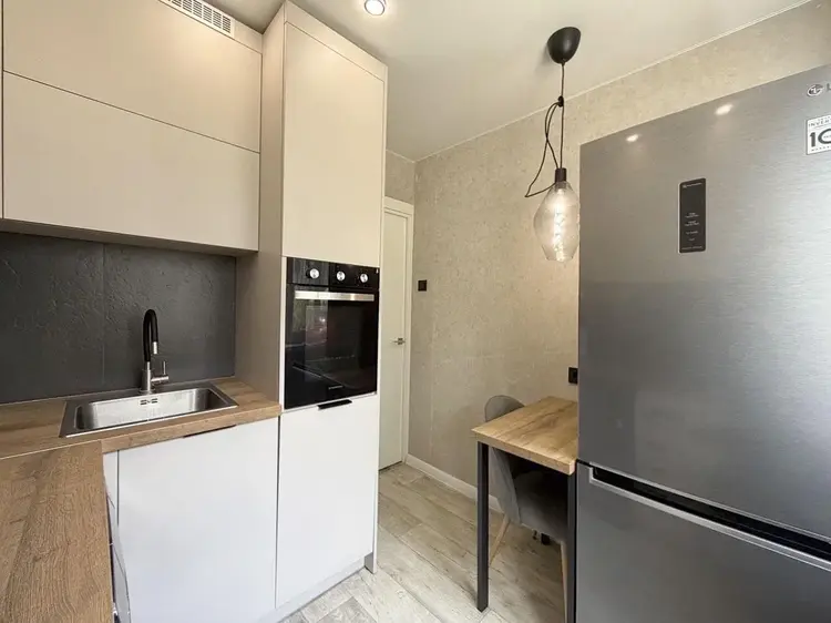 Встроенная кухня с доводчиками Blumи техникой (газовая варочная поверхность, духовой шкаф, посудомоечная машинка, стирально-сушильная машинка и холодильник). Обеденная группа в стиле «лофт» останется бонусом.