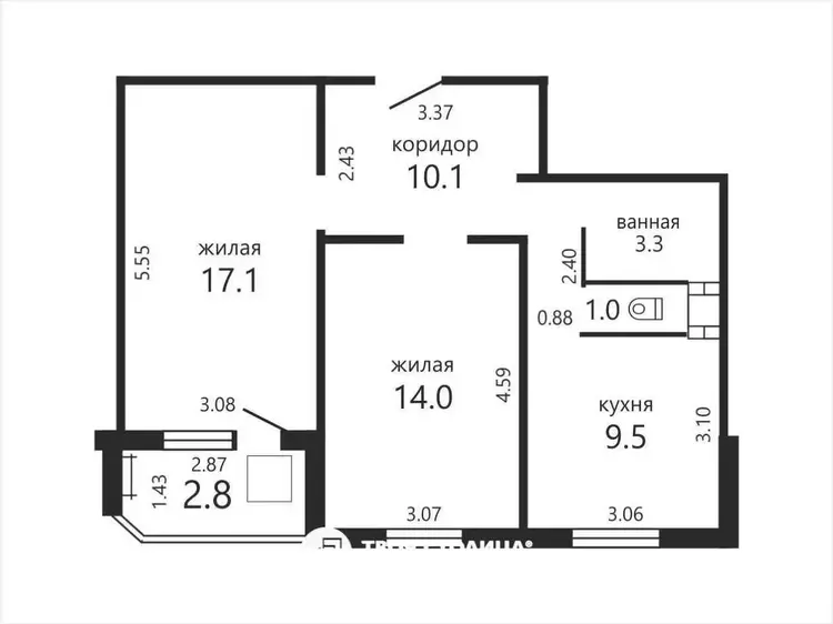 Жилая площадь - 31.1 м.кв.; кухня - 9.5 м.кв.