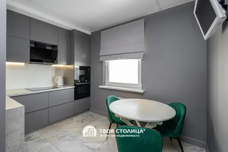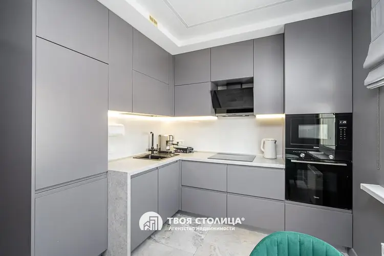 -Просторная кухня оборудована стильным дизайнерским кухонным гарнитуром со встроенной техникой и качественными смесителями.