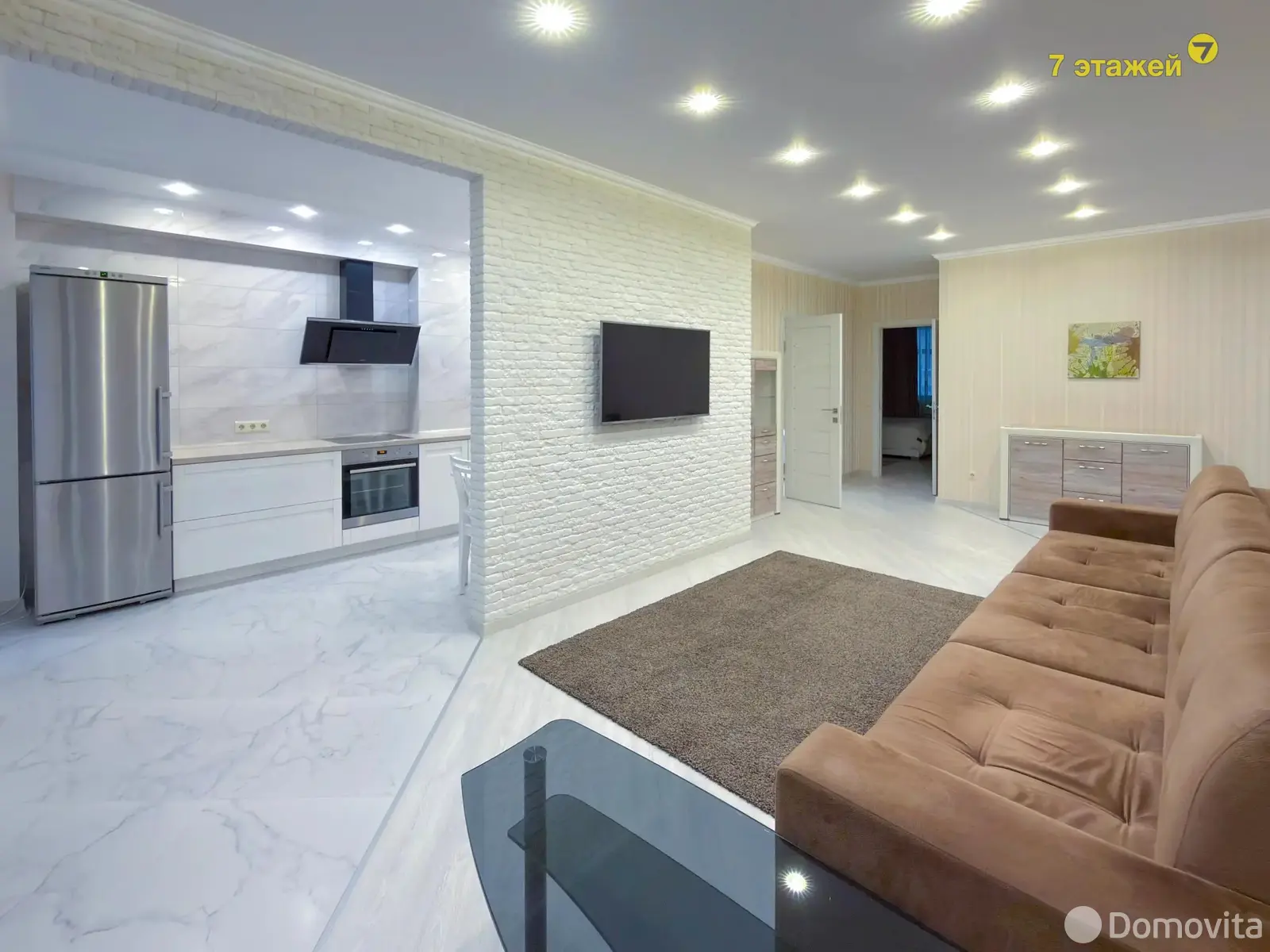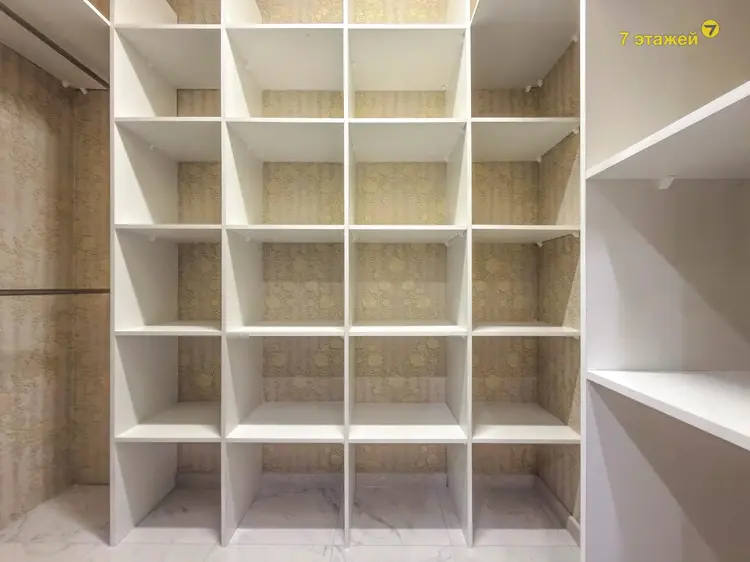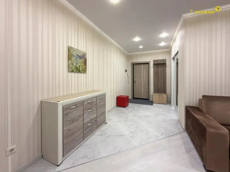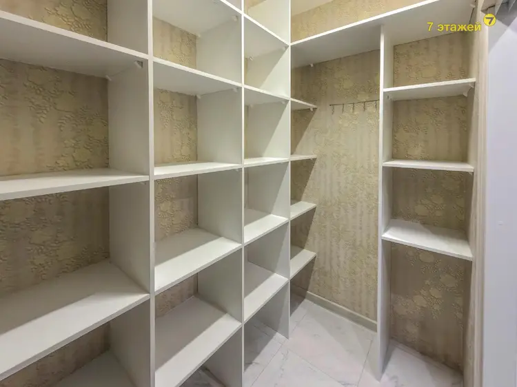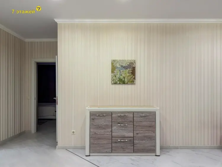 Квартира выполнена в светлой спокойной гамме с использованием качественных материалов. Кухня оформлена элегантными фасадами из натурального массива дерева и массивной столешницей. В санузле установлена надежная сантехника и современное зеркало с подсветкой. При входе обустроена удобная гардеробная.