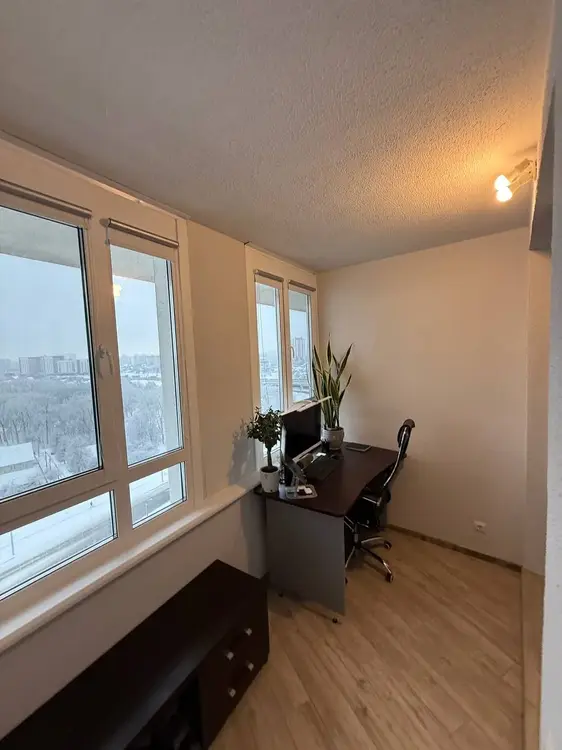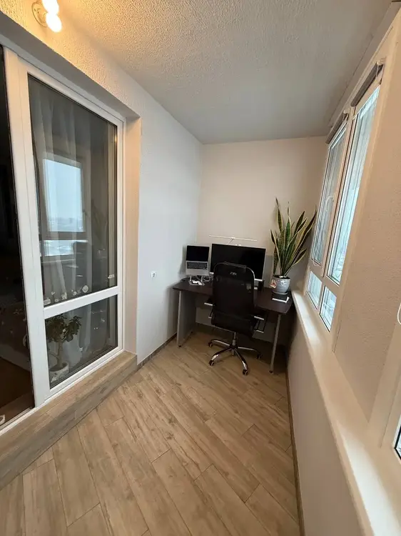 теплый балкон с новыми окнами (теплый профиль, двойные энергосберегающие стеклопакеты заполненные аргоном (установлены в октябре 2025 г), а балкон переоборудован под рабочий кабинет.