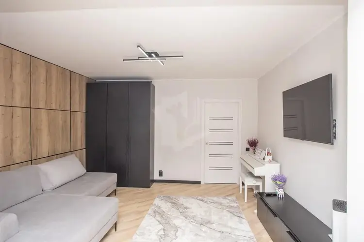 ü В большой комнате остается Большой шкаф тумба под телевизор и собственно сам телевизор, столик со стулом и кресло, стена со стороны дивана декорирована деревянными 3D панелями;